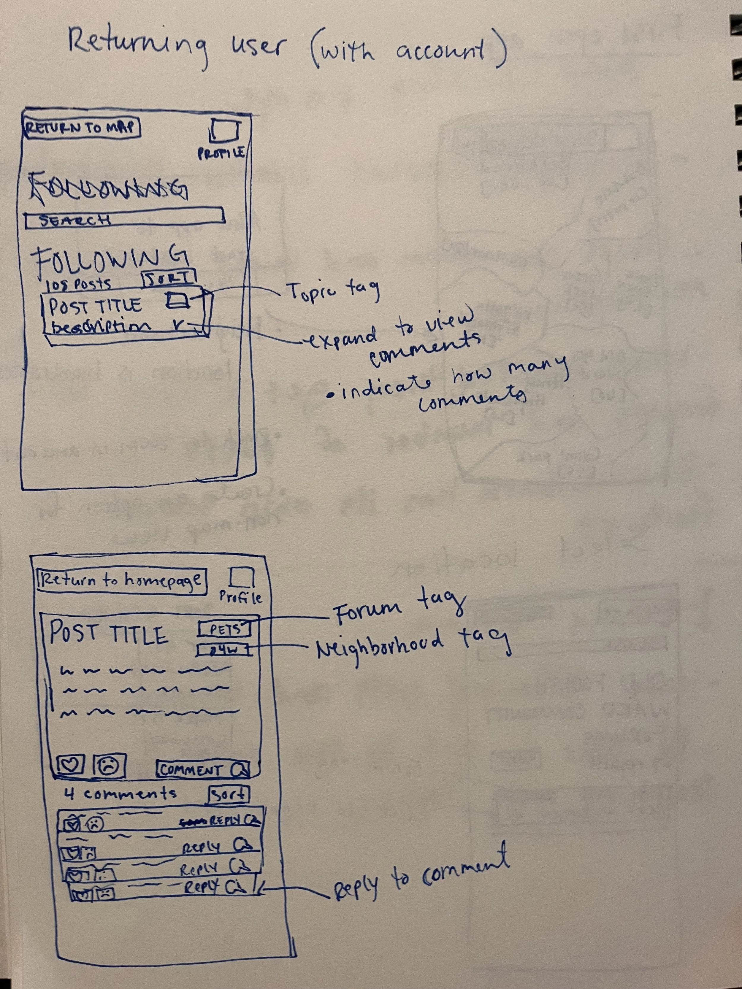 Users need to be able to populate a forum search through their chosen location and search radius. Users also should be able to interact with the posts by having their own account, display name, and profile. Along the process, encourage users to make real-life connections with their neighbors in a different way than they may have done previously.